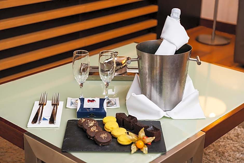 This large suite consists of a double bedroom and a separate living room with a flat-screen satellite TV. Amenities include a telephone, a mini bar, and a safe box for a laptop computer.